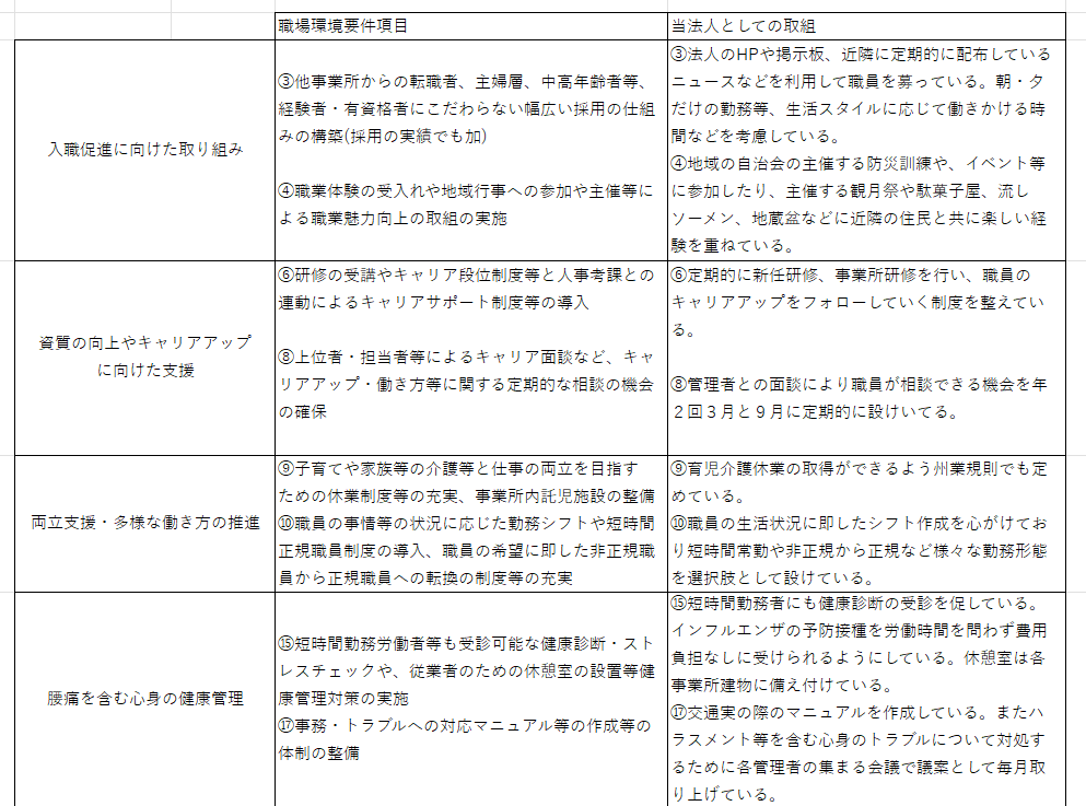 以上の要件に基づき当法人における処遇改善加算の取得状況及び職場環境要件につきまして、以下の通り公表いたします。